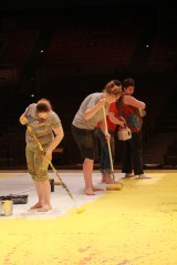 Remember as a child, you loved sticking your hand in paint and smooshing your fingers around? Was that just me? Luckily, as a theatre person, I still get to do that. We had decided earlier what the floor was going to look like, yellow with multi-colored paint splattered on it. In order for this to look effective, we need to pour watered down paint on the still wet yellow paint. Thus, began the flinging of paint. Handfuls were dropped onto the stage. Purple, pink, green, orange, blue, yellow, all watered down and tested by me.