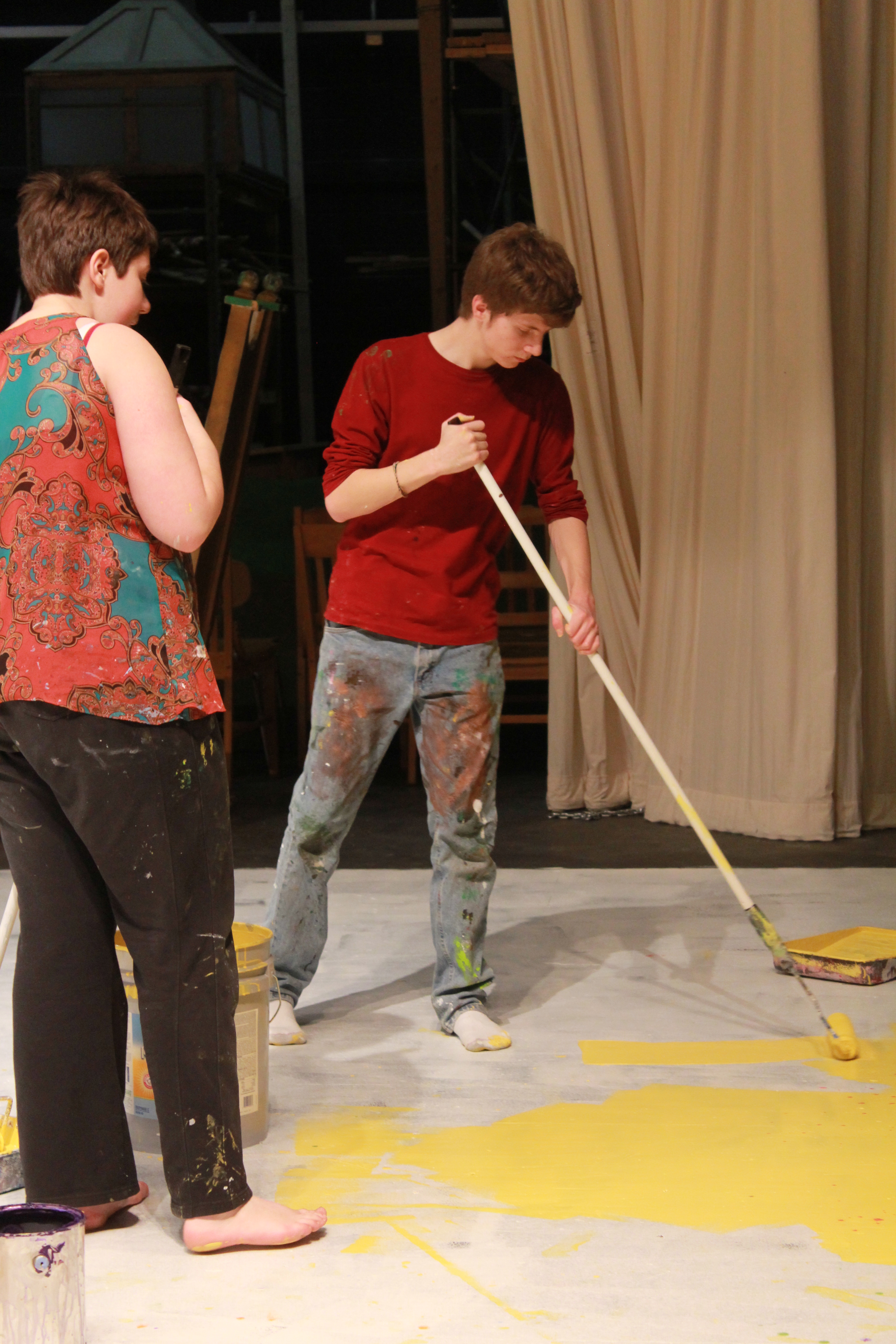 3 weeks ago, I spent my time before school and during lunch, painting the stage floor. We were moving the set into place that night, so we wanted to paint the floor under it before placing it. Lunch was filled with questions.