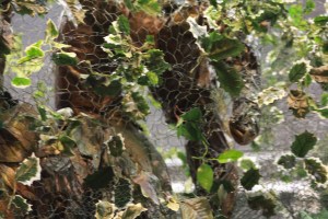Sadly, the tree did not look like a tree at this point. Other crew members claimed that it resembled a rabbit or an elephant. To fix this problem, we attached more chicken coop to the top of the tree and shaped it. After we spray painted the chicken coop green, I wedged fake leaves into the holes of the chicken coop.