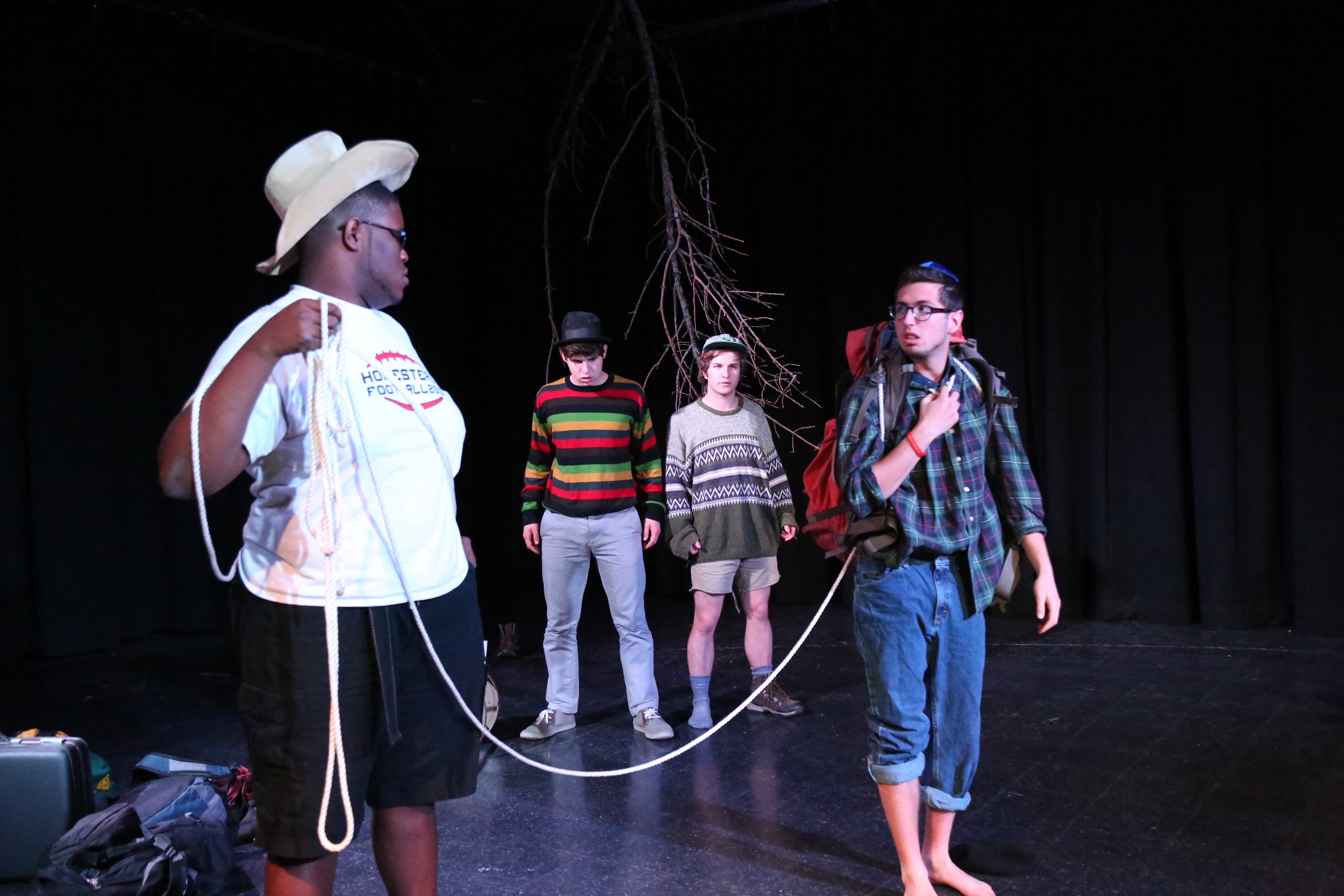 When Arabian Nights ended and we embarked on our independent projects, I had my chance. I asked my group to put on Beckett’s masterpiece. They agreed and we set off to work. Waiting for Godot provides more freedom then most productions. Just about the only line connoting a specific setting or time period references the construction of the Eiffel Tower forty years before the play’s events. Other than that, all Samuel Beckett tells us about is a road, a bog, and a lone tree. I joked about incorporating a pirate setting – a hooked and eyepatched Pozzo, a cannon and steering wheel on the stage – but we ultimately decided against such ridiculousness. The concept we eventually settled on envisioned Estragon and Vladimir as hikers of sorts, placing their vagabond equality in contrast with Pozzo’s and Lucky’s hierarchical relationship. For the minimalist set, we used a huge tree branch hung from the ceiling and a pile of suitcases and backpacks. I envision them as linking the main jar actors to the collective memory of all society, but it is open to audience interpretation. As we came up with ideas and blocked our scenes, I became increasingly excited for what we’d put together.