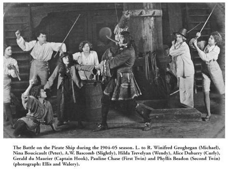 Nina Boucicault playing Peter Pan in 1904Hilda Trevelyan with Nina Boucicault (1867- 1950) in the title role in the first production of ‘Peter Pan’ at the Duke of York’s Theatre, December 1904.Gerald du Maurier as Captain Hook and Mr Darling