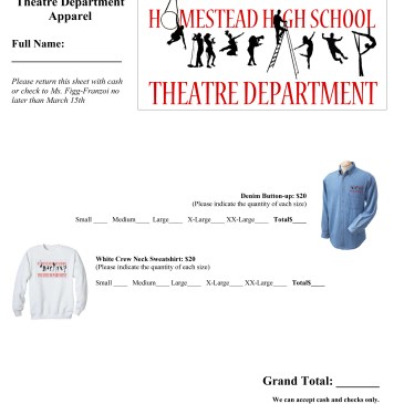 It’s official!! Finally!! Theatre Apparel is back!! This year we are offering two shirts! We are bringing back the white sweatshirt and offering a new denim button up. Both will be $20 to purchase. Below is the order form. You can also pick one up outside the Black Box. White Sweatshirt Apparel