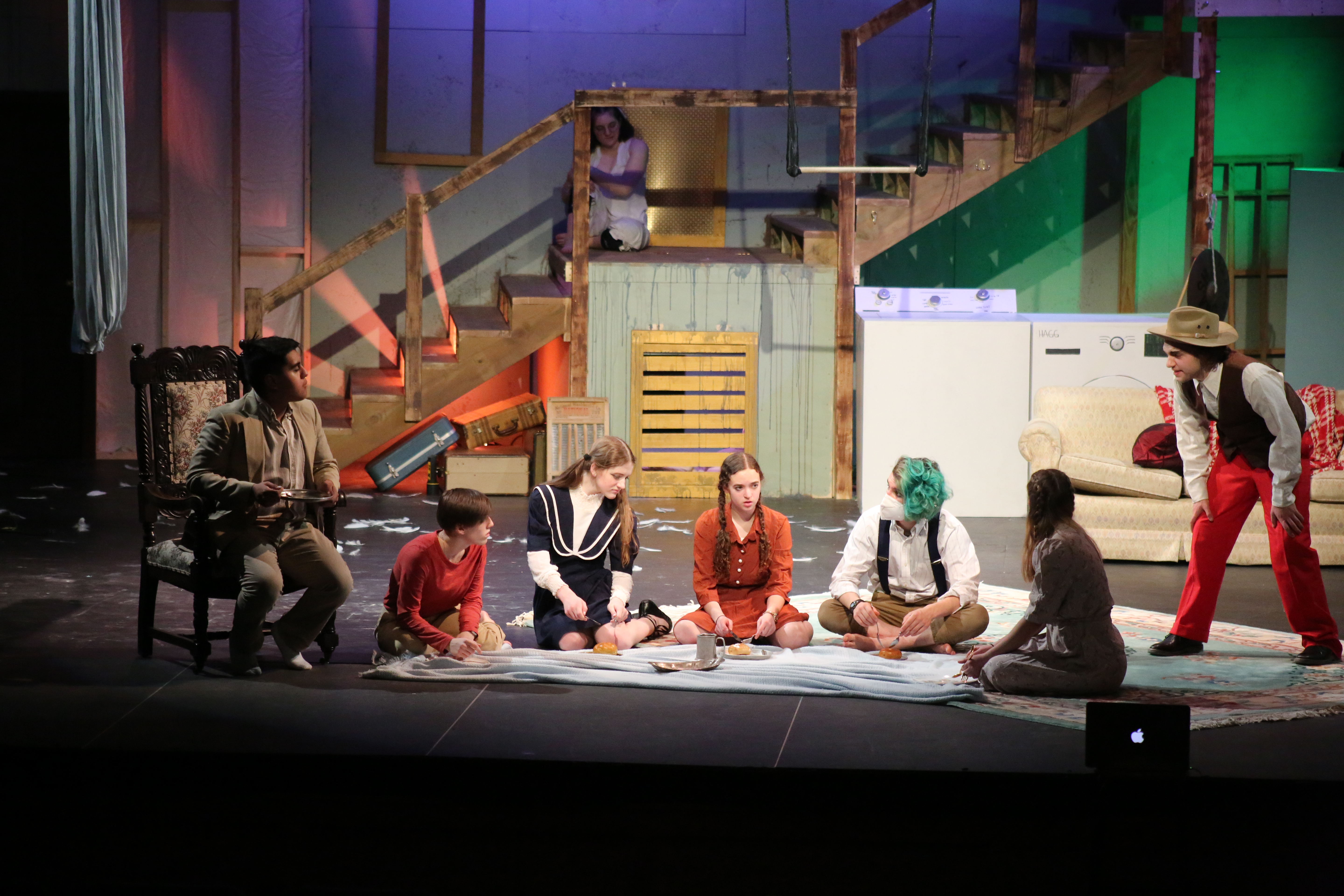 The players, nameless, faceless, and interchangeable, are not identified by specific character names. Each one, strong veteran actors all, delightfully convincing, seems to disappear within the ensemble, nimble and graceful in their pantomime, dialogue, and song. Without a moment’s notice, they change characters and the fast pace challenges the audience to keep up with each story.