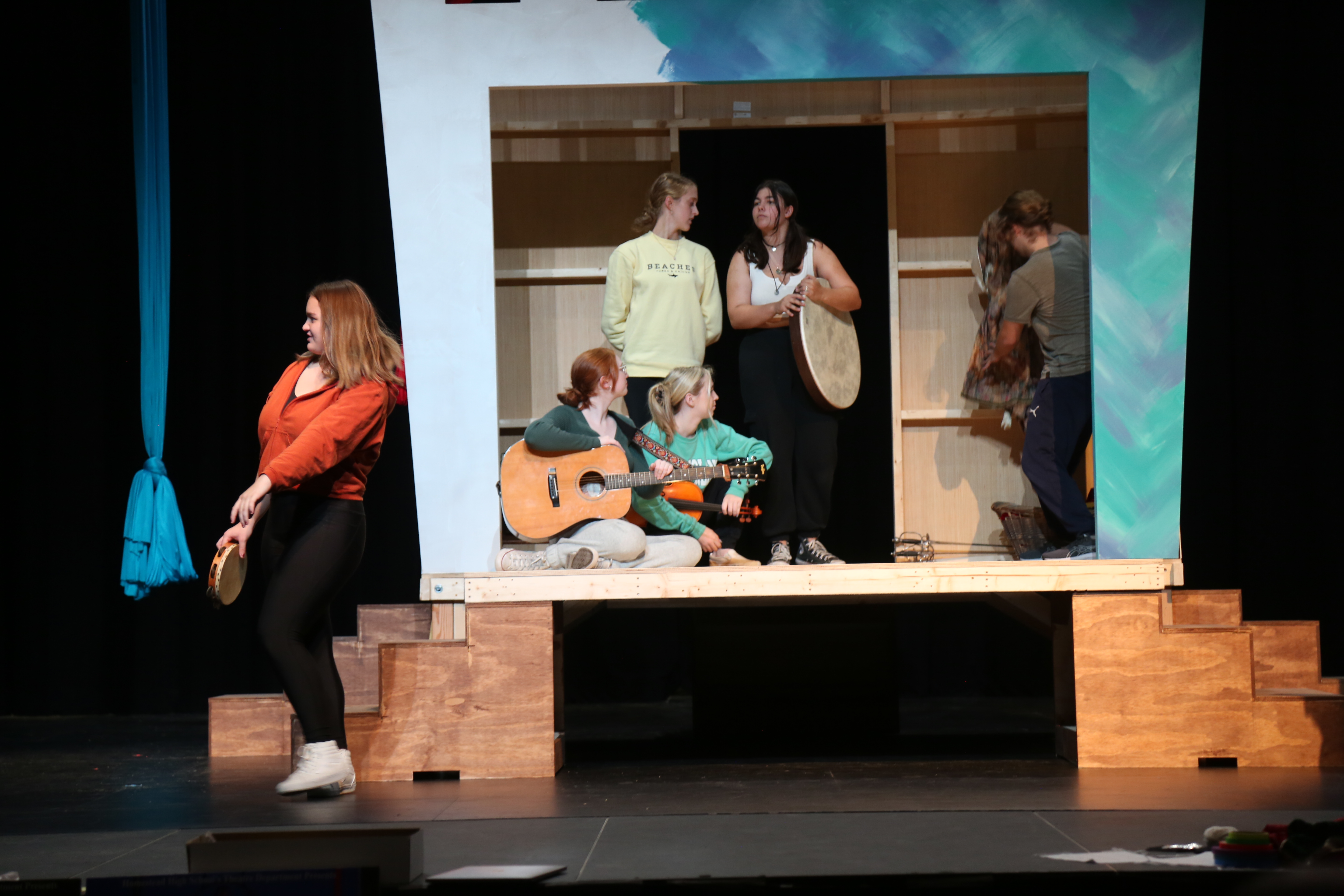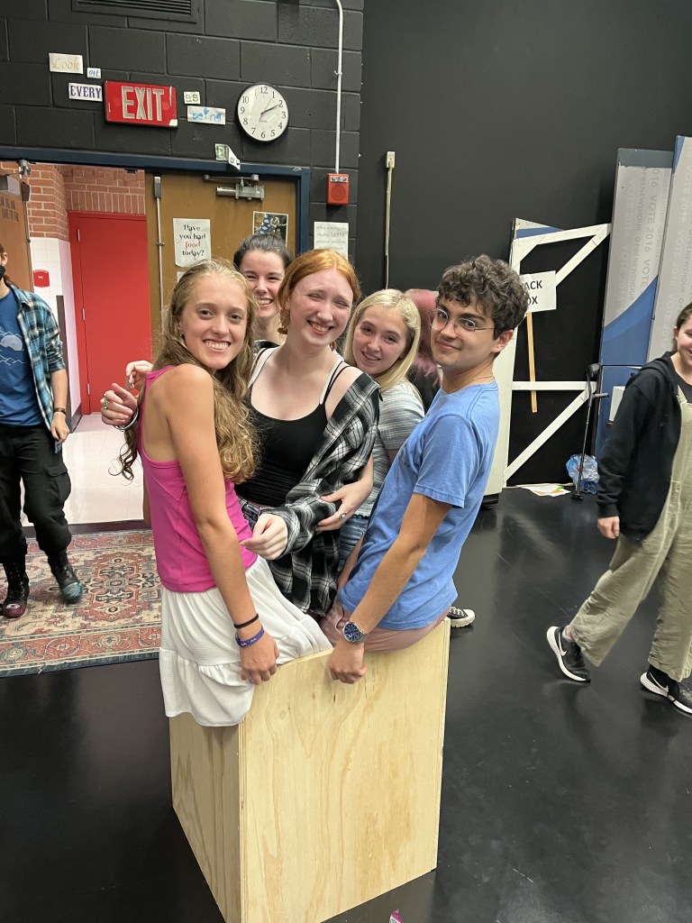 The rehearsal process for one act is a collaboration of many ideas. The practices are never the same; they are different each day depending on what needs to be choreographed or worked on. Overall it’s a student-led production, we go off into small groups to create something then come together as a big group to meld the ideas. This year I play a Tragedian with 4 other people, these are my favorite types of roles. We don’t have any lines to learn but we get to help carry the story along. Each of the Tragedians needs to have their own special type of movement. One of the things we needed to do to help us was to find a video of a person who walked and talked like we saw our character. We get to work really closely with each other which is a fun time for everyone.