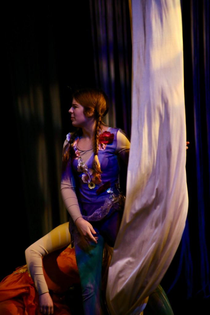 I act as one of Titania’s loyal fairies. Under the umbrella of acting falls singing, interpretive dancing, crawling, contorting myself in the most awkward of positions, and most of all, aerial silks. The fairies are a very visual part of the show, as we are up in the air for a good part of it, and it has been so fun creating with this new medium.